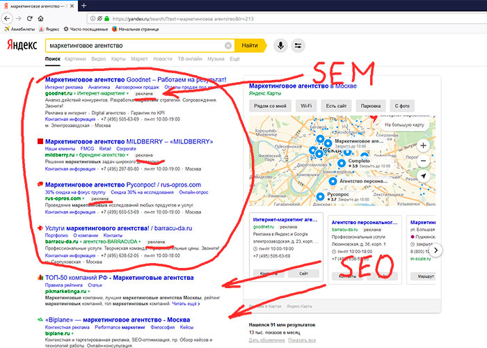 SEM – платные объявления, размещенные на страницах результатов поиска.